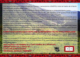 Los wichis conviven con la impunidad. Hace tres meses la justicia detuvo sin razón a uno de los referentes de la comunidad, Agustín Santillán, quien permanece preso. “Para ellos los delincuentes somos nosotros, y tenemos causas armadas. Actualmente Agustín Santillán está preso y yo estoy con orden de detención, presa en mi propia vida. Esto tiene que parar. Nación debería hacer presencia en nuestros lugares. Pareciera que el norte es otro país, que no pertenece a la Argentina” Los wichis vienen denunciando la convivencia entre la droga y funcionarios municipales. Hace un año que el Intendente Victor Adolfo Pérez estuvo involucrado en un hecho relacionado con el narcotráfico, pero –una vez más- jamás fue citado por la Justicia.